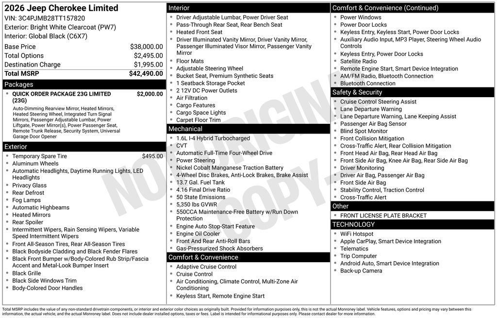 Lia Chrysler Jeep Dodge is delighted to offer this good-looking 2026 Jeep Cherokee Limited in Bright White Clearcoat Beautifully equipped with Quick Order Package 23G Limited (Auto-Dimming Rear-View Mirror, Capri Leatherette Perforated Seats, Cognac Interior Stitching, Exterior Mirrors Courtesy Lamps, Exterior Mirrors with Supplemental Signals, Gloss Black Mirrors, Heated Exterior Mirrors, Heated Steering Wheel, Limited Badge, Power 2-Way Passenger Lumbar Adjust, Power Adjust 6-Way Front Passenger Seat, Power Liftgate, Power Multi-Function Foldaway Mirrors, Security Alarm, Universal Garage Door Opener, and Wireless Charging Pad), 1.6L I4, 4-Wheel Disc Brakes, 4.16 Final Drive Ratio, 4G LTE Wi-Fi Hot Spot, 6 Speakers, ABS brakes, Air Conditioning, Alloy wheels, AM/FM radio: SiriusXM with 360L, Apple CarPlay, Apple CarPlay/Android Auto, Auto High-beam Headlights, Automatic temperature control, Brake assist, Compass, Delay-off headlights, Driver door bin, Driver vanity mirror, Dual front impact airbags, Dual front side impact airbags, Electronic Stability Control, Emergency communication system, Four wheel independent suspension, Front anti-roll bar, Front Bucket Seats, Front Center Armrest, Front dual zone A/C, Front fog lights, Front License Plate Bracket, Front reading lights, Fully automatic headlights, Global Telematics Box Module (TBM), Google Android Auto, GPS Antenna Input, Heated door mirrors, Heated front seats, Illuminated entry, Knee airbag, Low tire pressure warning, Occupant sensing airbag, Outside temperature display, Overhead airbag, Overhead console, Panic alarm, ParkView Rear Back-Up Camera, Passenger door bin, Passenger vanity mirror, Power door mirrors, Power driver seat, Power steering, Power windows, Radio data system, Radio: Uconnect 5 with 12.3 Display, Rain sensing wipers, Rear anti-roll bar, Rear reading lights, Rear seat center armrest, Rear side impact airbag, Rear window defroster, Rear window wiper, Remote Keyless Entry, SiriusXM with 360L, Soul Cloth Seats with Labyrinth Embossing, Speed control, Speed-sensing steering, Split folding rear seat, Spoiler, Steering wheel mounted audio controls, Tachometer, Telescoping steering wheel, Tilt steering wheel, Traction control, Trip computer, US/Canada Connectivity, Variably intermittent wipers, Voltmeter, and Wheels: 18 x 7 Machine Face Painted Aluminum!