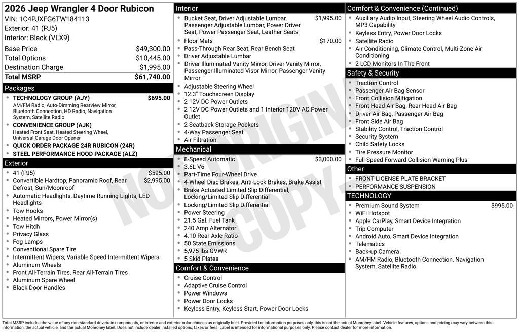 Lia Chrysler Jeep Dodge is very proud to offer this good-looking and fun 2026 Jeep Wrangler Rubicon in 41 Beautifully equipped with Convenience Group (Heated Front Seats, Heated Steering Wheel, and Universal Garage Door Opener), Quick Order Package 24R Rubicon, Steel Performance Hood Package (Performance Hood), Technology Group (12.3 Touchscreen Display, 4G LTE Wi-Fi Hot Spot, Apple CarPlay, Auto-Dimming Rear-View Mirror, Connected Travel and Traffic Services, Connectivity - US/Canada, For More Info, Call 800-643-2112, Google Android Auto, GPS Navigation, HD Radio, Integrated Center Stack Radio, Integrated Off-Road Camera, Integrated Voice Command with Bluetooth®, Radio: Uconnect 5 Navigation with 12.3 Display, SiriusXM Radio Service, and SiriusXM with 360L), 4-Wheel Disc Brakes, 4.10 Rear Axle Ratio, 8 Speakers, ABS brakes, Air Conditioning, Alloy wheels, Alpine Premium Audio System, AM/FM radio: SiriusXM with 360L, Apple CarPlay/Android Auto, Automatic temperature control, Aux Battery, Auxiliary Switches, Brake assist, Class II Receiver Hitch, Cloth Low-Back Bucket Seats, Compass, Delay-off headlights, Driver door bin, Driver vanity mirror, Dual front impact airbags, Dual front side impact airbags, Electronic Stability Control, Emergency communication system: Jeep Connect, Front anti-roll bar, Front Bucket Seats, Front Center Armrest w/Storage, Front dual zone A/C, Front fog lights, Front License Plate Bracket, Front reading lights, Fully automatic headlights, Heated door mirrors, Illuminated entry, Integrated roll-over protection, Low tire pressure warning, MOPAR All-Weather Floor Mats, Non-Lock Fuel Cap Without Discriminator, Occupant sensing airbag, Outside temperature display, Overhead airbag, Panic alarm, ParkView Rear Back-Up Camera, Passenger door bin, Passenger vanity mirror, Performance Suspension, Power door mirrors, Power steering, Power Top Quarter Window Storage Bag, Power windows, Radio data system, Radio: Uconnect 5 with 12.3 Display, Rear anti-roll bar, Rear reading lights, Rear Window Defroster, Rear Window Wiper/Washer, Remote Keyless Entry, Removable Rear Quarter Windows, Security system, Sky One-Touch Power Top, Speed control, Split folding rear seat, Steering wheel mounted audio controls, Stop-Start Dual Battery System, Tachometer, Telescoping steering wheel, Tilt steering wheel, Traction control, Trip computer, Variably intermittent wipers, Voltmeter, and Wheels: 17 x 7.5 Machined/Painted Black!
