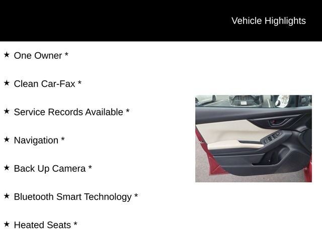 One Owner *, Clean Car-Fax *, Service Records Available *, Navigation *, Back Up Camera *, Bluetooth® Smart Technology *, Heated Seats *, 16 Alloy Wheels, ABS brakes, Apple CarPlay/Android Auto, Dual front impact airbags, Dual front side impact airbags, Fully automatic headlights, Heated door mirrors, Illuminated entry, Power door mirrors, Radio: Subaru Starlink 6.5 Multimedia System, Remote keyless entry, Security system.