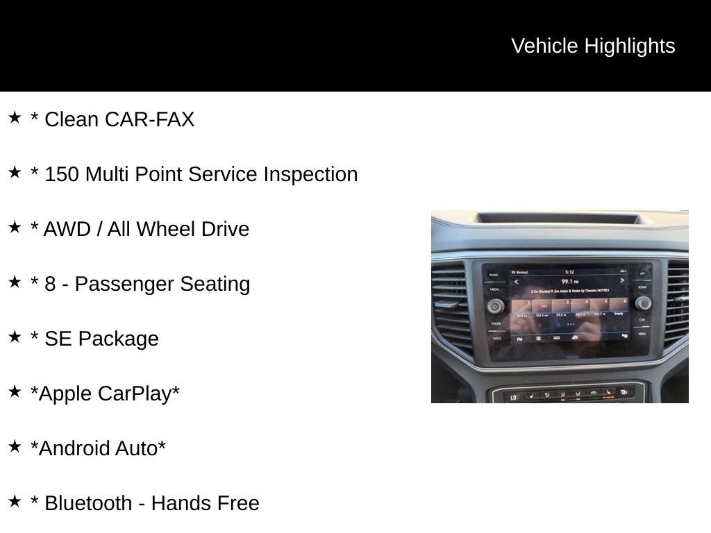 * Clean CAR-FAX, * 150 Multi Point Service Inspection, * AWD / All Wheel Drive, * 8 - Passenger Seating, * SE Package, *Apple CarPlay*, *Android Auto*, * Bluetooth® - Hands Free, * Steering Wheel Audio Controls, * Rear Backup Camera, * Blind Spot Monitoring, * Rear Cross Traffic Alert, * Pushbutton Start, * Leather Seats, * LED Headlights, Atlas 3.6L V6 SE 4Motion, AWD.