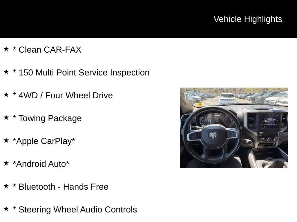 * Clean CAR-FAX, * 150 Multi Point Service Inspection, * 4WD / Four Wheel Drive, * Towing Package, *Apple CarPlay*, *Android Auto*, * Bluetooth® - Hands Free, * Steering Wheel Audio Controls, * Remote Vehicle Starter, * Rear Backup Camera, * Pushbutton Start, * Remote Keyless Entry, * Power Drivers Seat, * Sirius XM Radio, * Premium Wheels, * Tonneau Cover, * Running Boards, 1500 Big Horn, 4WD, ABS brakes, Alloy wheels, Compass, Electronic Stability Control, Heated door mirrors, Illuminated entry, Low tire pressure warning, ParkView Rear Back-Up Camera, Remote keyless entry, Traction control.
