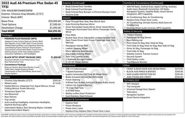 Black Optic Exterior Package, Black Optic Sport Package, Convenience Package, Navigation system: MMI Navigation plus, Power moonroof, Premium Plus Package, Radio: MMI Navigation Plus w/MMI Touch Response.