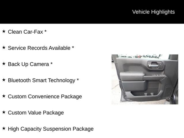 Clean Car-Fax *, Service Records Available *, Back Up Camera *, Bluetooth® Smart Technology *, 6-Speaker Audio System, ABS brakes, Apple CarPlay/Android Auto, Automatic Emergency Braking, Custom Convenience Package, Custom Value Package, Dual front impact airbags, Dual front side impact airbags, Fully automatic headlights, High Capacity Suspension Package, Illuminated entry, Lane Keep Assist w/Lane Departure Warning, Power door mirrors, Power driver seat, Premium audio system: Chevrolet Infotainment 3, Remote Vehicle Starter System, Security system, Wheels: 20 x 9 Bright Silver Painted Aluminum.