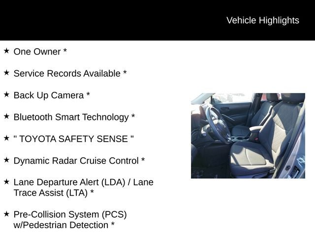 One Owner *, Service Records Available *, Back Up Camera *, Bluetooth® Smart Technology *, TOYOTA SAFETY SENSE , Dynamic Radar Cruise Control *, Lane Departure Alert (LDA) / Lane Trace Assist (LTA) *, Pre-Collision System (PCS) w/Pedestrian Detection *, Automatic High Beams *, 17 Alloy Wheels, 6 Speakers, ABS brakes, AM/FM radio: SiriusXM, Apple CarPlay/Android Auto, Automatic temperature control, Dual front impact airbags, Dual front side impact airbags, Fully automatic headlights, Heated door mirrors, Illuminated entry, Moonroof Package, Power door mirrors, Remote keyless entry, Security system, Tilt & Slide Moonroof.