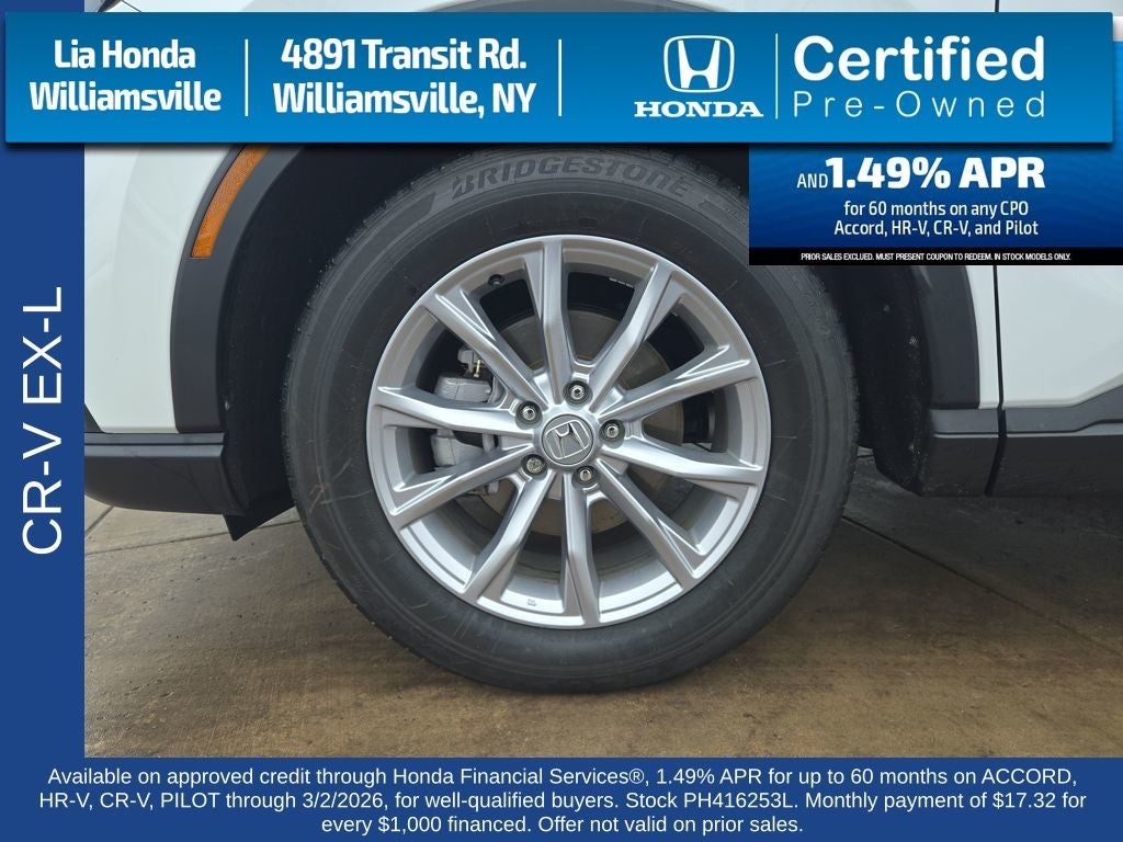 Meticulously designed with your needs in mind, the CR-V EX-L boasts a host of premium features that elevate your driving experience. Enjoy the convenience of wireless Apple CarPlay/Wireless Android Auto, the comfort of heated front bucket seats, and the added security of Adaptive Cruise Control with Low-Speed Follow. The powerful 1.5L I4 DOHC 16V engine, paired with the smooth-shifting CVT and AWD system, delivers exceptional performance and efficiency, with an EPA-estimated 27 city/32 highway MPG.