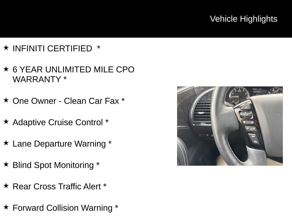INFINITI CERTIFIED *, 6 YEAR UNLIMITED MILE CPO WARRANTY *, One Owner - Clean Car Fax *, Adaptive Cruise Control *, Lane Departure Warning *, Blind Spot Monitoring *, Rear Cross Traffic Alert *, Forward Collision Warning *, Bose Audio *, Navigation system: INFINITI InTouch Navigation. Odometer is 2704 miles below market average!