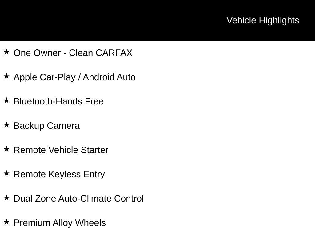 One Owner - Clean CARFAX, Apple Car-Play / Android Auto, Bluetooth-Hands Free, Backup Camera, Remote Vehicle Starter, Remote Keyless Entry, Dual Zone Auto-Climate Control, Premium Alloy Wheels, Full Power Options: Locks & Windows, Cruise Control. 29/35 City/Highway MPG