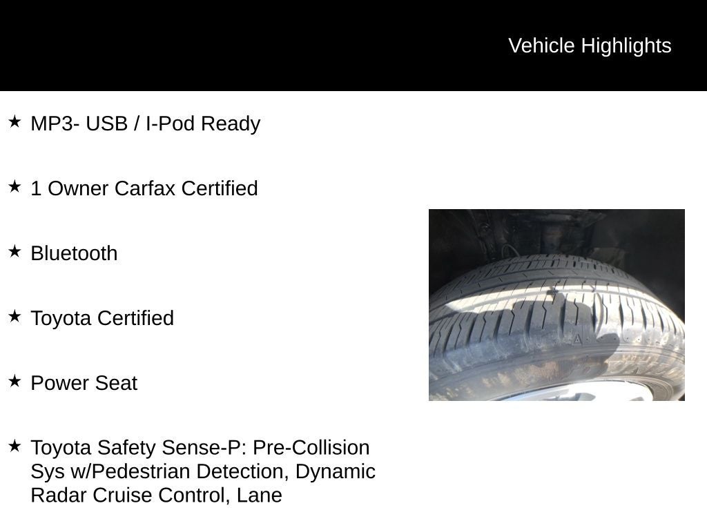 - Toyota Safety Sense-P: Pre-Collision Sys w/Pedestrian Detection, Dynamic Radar Cruise Control, Lane