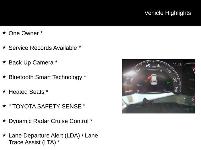 One Owner *, Service Records Available *, Back Up Camera *, Bluetooth® Smart Technology *, Heated Seats *, TOYOTA SAFETY SENSE , Dynamic Radar Cruise Control *, Lane Departure Alert (LDA) / Lane Trace Assist (LTA) *, Pre-Collision System (PCS) w/Pedestrian Detection *, Automatic High Beams *, 3 Spoke Leather Heated Steering Wheel, 6 Speakers, ABS brakes, AM/FM radio: SiriusXM, Automatic temperature control, Convenience Package, Dual front impact airbags, Dual front side impact airbags, Front Door Smart Key System w/Push Button Start, Front dual zone A/C, Fully automatic headlights, Heated door mirrors, Illuminated entry, Panic alarm, Power driver seat, Rain Sensing Front Wipers, Remote keyless entry, Tilt & Slide Moon Roof, XLE Grade Weather Package.