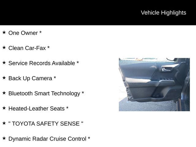 One Owner *, Clean Car-Fax *, Service Records Available *, Back Up Camera *, Bluetooth® Smart Technology *, Heated-Leather Seats *, TOYOTA SAFETY SENSE , Dynamic Radar Cruise Control *, Lane Departure Alert (LDA) / Lane Trace Assist (LTA) *, Pre-Collision System (PCS) w/Pedestrian Detection *, Automatic High Beams *, 17 Machined Alloy Wheels, 6 Speakers, ABS brakes, AM/FM radio: SiriusXM, Apple CarPlay/Android Auto, Automatic temperature control, Blind Spot Monitor w/Rear Cross Traffic Alert, Dual front impact airbags, Dual front side impact airbags, Front dual zone A/C, Front fog lights, Garage door transmitter: HomeLink, Heated door mirrors, Illuminated entry, Power door mirrors, Power driver seat, Power Sliding Rear Window w/Privacy Glass, Power Tilt/Slide Moonroof, Radio: Premium JBL Audio w/Dynamic Navigation, Rear Parking Assist Sonar, Remote keyless entry, Security system, Technology Package, TRD Premium Sport Package, TRD Sport Package.