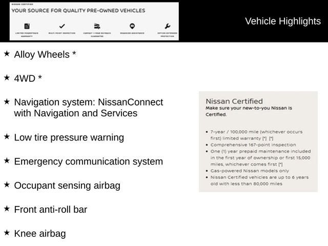 * 7 Year/100,000 Mile Limited Warranty, 24/7 Hour Roadside Assistance, Carfax Vehicle History Report, Plus 1 Year Pre-Paid Maintenance Included. Gas Powered Nissan Models Only.