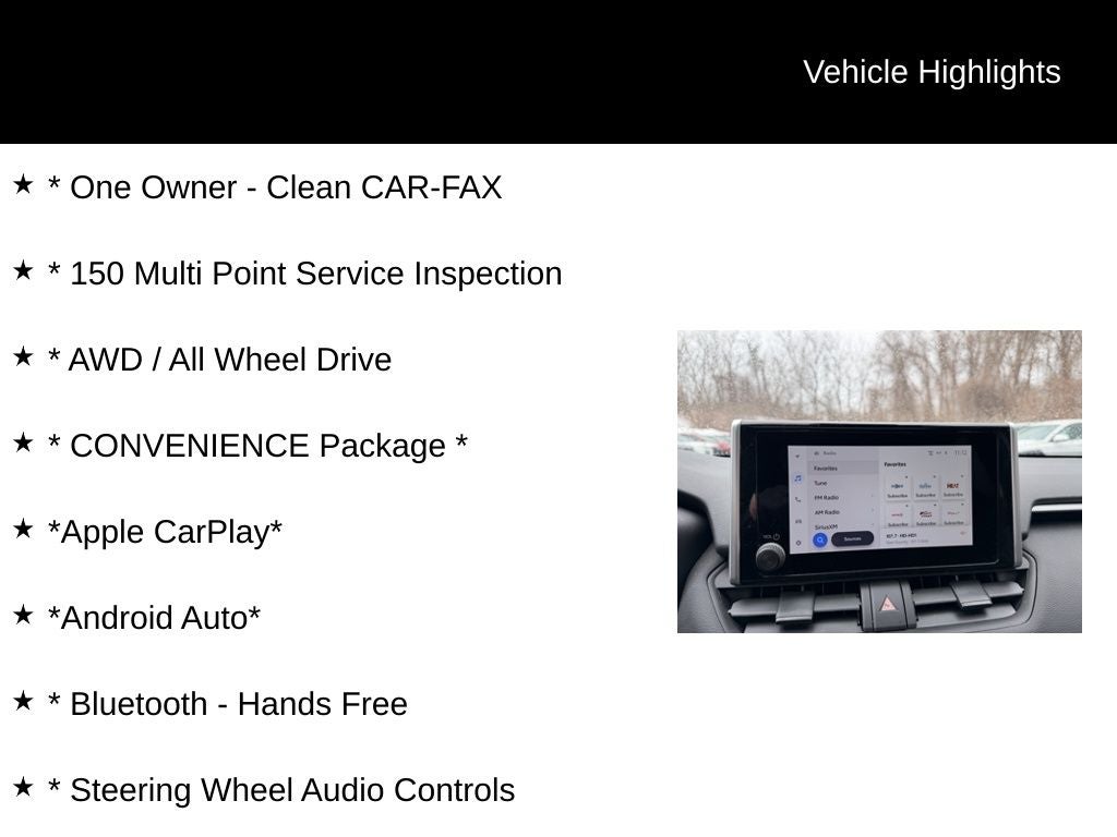 * One Owner - Clean CAR-FAX, * 150 Multi Point Service Inspection, * AWD / All Wheel Drive, * CONVENIENCE Package *, *Apple CarPlay*, *Android Auto*, * Bluetooth® - Hands Free, * Steering Wheel Audio Controls, * Rear Backup Camera, * Adaptive Cruise Control, * Lane Departure Warning, * Blind Spot Monitoring, * Rear Cross Traffic Alert, * Forward Collision Warning, * Pushbutton Start, * Remote Keyless Entry, * Power Drivers Seat, * Heated Seats, *Heated Steering Wheel*, * Power Moonroof / Sunroof, * Dual-Zone Climate Control, * Sirius XM Radio, * Power Liftgate, * LED Headlights, * Premium Wheels, RAV4 Hybrid XLE, AWD.